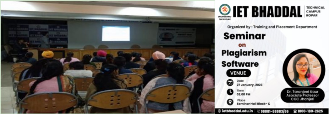 Dr. Taranjeet Kaur, Associate Professor at CGC Jhanjeri, conducted a one-day seminar on plagiarism software on 27th Jan 2023 at IET Bhaddal. The seminar aimed at educating faculty members and students about the significance of maintaining academic integrity and using plagiarism detection tools. The session was interactive, with practical demonstrations of the software.