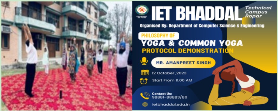 A session on the "Philosophy of Yoga and Common Yoga Protocol Demonstration" was organized on October 12, 2023.The event aimed to educate participants about the ancient philosophy of Yoga and offer a practical demonstration of the Common Yoga Protocol (CYP), fostering physical and mental well-being.The session's main objective was to introduce participants to the core principles of Yoga, its spiritual and health benefits, and to demonstrate a series of simple yet effective Yoga practices that can be incorporated into daily life.