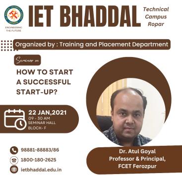 Dr. Atul Goyal, Professor and Principal at FCET Ferozepur, conducted a seminar on 'How to Start a Successful Start-up.' The seminar focused on the key steps involved in launching a start-up, including identifying business ideas, creating a business plan, and securing funding. Dr. Goyal also emphasized the importance of market research, risk management, and building a strong team.