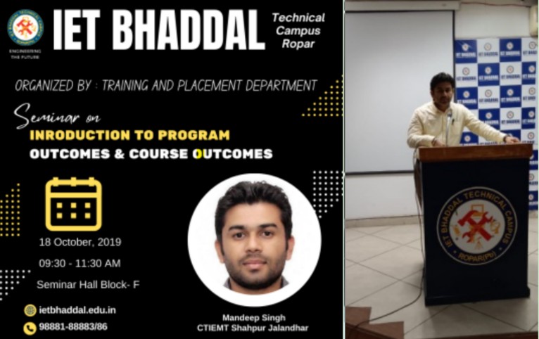 Er. Mandeep Singh, Head of CTIEMT Shahpur Jalandhar, conducted a seminar on 'Introduction to Program Outcomes and Course Outcomes.' He explained the significance of defining clear learning outcomes in academic programs to ensure quality education. He discussed the distinction between program outcomes (POs) and course outcomes (COs), highlighting their role in curriculum development.