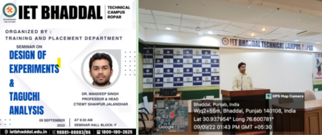 On 9th September 2022, Dr. Mandeep Singh, Professor and Head at CTIEMT Shahpur Jalandhar, conducted a seminar on \'Design of Experiments and Taguchi Analysis.\' He introduced key concepts of experimental design and explained the Taguchi method\'s application in quality control and optimization.