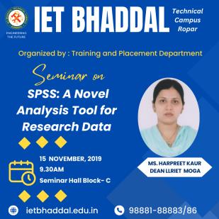 Ms. Harpreet Kaur, Dean of LLRIET, Moga, conducted a workshop on 'SPSS: A Novel Analysis Tool for Research Data.' The session focused on using SPSS for statistical analysis in academic and professional research. Ms. Kaur demonstrated data entry, analysis techniques, and interpretation of results through practical examples.
